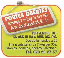 Ben segur que tots heu anat a alguna jornada de portes obertes d’aquestes que els agrada tant de convocar els ajuntaments per veure nous equipaments –ara la cosa va més escassa, per la crisi–, però potser no heu anat mai a un dia de portes obertes... per vendre tot el que hi ha en un pis! Doncs, com anunciava El Divendres, aquest pis del carrer d’Urgell en feia una per vendre tot el que hi havia. Em sap greu, però us ho heu perdut, perquè l’esdeveniment ja s’ha produït, però no em negareu que la idea no és ben original.