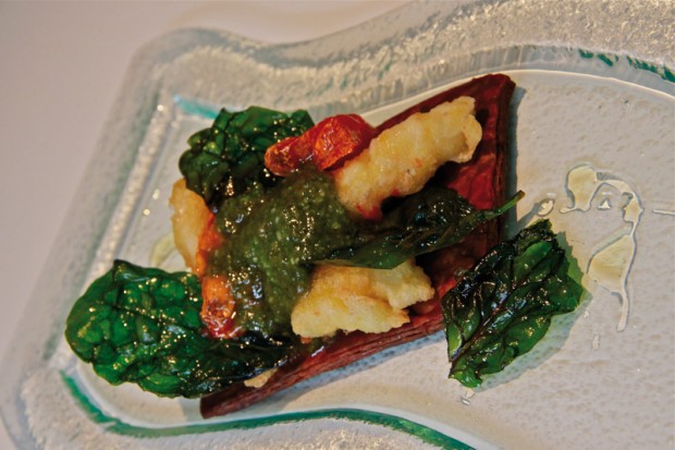 Coca de bacallà amb pesto d’oliva verda i cruixent d’espinacs