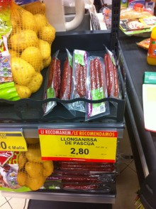 Precisament per Nadal es posa en venda tota la línia de productes alimentaris que serveixen per afartar-nos a més no poder durant deu dies. Per Pasqua, la cosa és més austera. De fet, per Quaresma, molts encara segueixen la tradició de no menjar carn. I, òbviament, a botigues i supermercats creix la venda de bacallà. Bé, potser no a tots els establiments. A la cadena valenciana Mercadona, aquestes dates serveixen per posar en venda la “llonganissa de Pascua”. La veiem — amb error ortogràfic inclòs— en una imatge del supermercat del carrer de l’Arquitecte Gaudí. El producte, envasat en lots de tres, és una mena de secallona sense assecar que no sé pas si té gaire tirada.