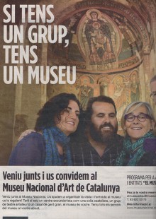 Una cara ben coneguda del periodisme local (aquest mes que toquem de ple el tema) és el company Toni Mata i Riu, una de les ensenyes del diari Regió7. El Toni, com sol passar amb els redactors de cultura en general, s’apassiona amb bona part dels temes que tracta. Per això, es habitual veure-li signar cròniques i crítiques d’estrenes d’espectacles a Barcelona i recomanacions d’esdeveniments i mostres que es fan més enllà de l’àmbit que cobreix la capçalera per la qual treballa. En fi, que, com a bon periodista, li agrada ficar el nas a tot arreu on hi ha flaire cultural. Per tot plegat, m’ha sobtat agradablement l’aparició que fa en un anunci a la premsa gràfica del Museu Nacional d’Art de Catalunya (MNAC) en el qual promociona les visites en grup. El podeu veure en la imatge adjunta extreta del suplement “Presència” d’El Punt Avui”. El mateix anunci també s’ha anat publicant a “Regió7” en les últimes setmanes, però, evidentment, i com que hi fa de figurant, el rotatiu no n’ha dit res. Aquí sí que ho fem. M’agrada comprovar que els amants de la cultura i la divulgació sempre es posen al servei del país.