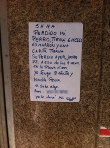 La relació entre mascotes i infants sol ser entendridora encara que, sovint, les criatures els n’hi facin de l’alçada d’un campanar. No deu ser el cas del nen de vuit anys que va perdre el seu gosset de mesos a la Plana de l’Om tal com mostra el cartell que va veure penjat i va retratar un amable lector al carrer del Born. No sé pas si va ser el mateix vailet qui va saber expressar tan bé —tot i la cal•ligrafia casolana— el sentiment de pena que podeu llegir a la imatge. En tot cas, només pel fet d’oferir la guardiola de recompensa a qui trobés el gos, el nen ja es mereix tota la sort del món. Espero que l’animal hagi aparegut o que, en el pitjor dels casos, tingui un nou amo que el tracti tan com ho devia fer l’anterior.