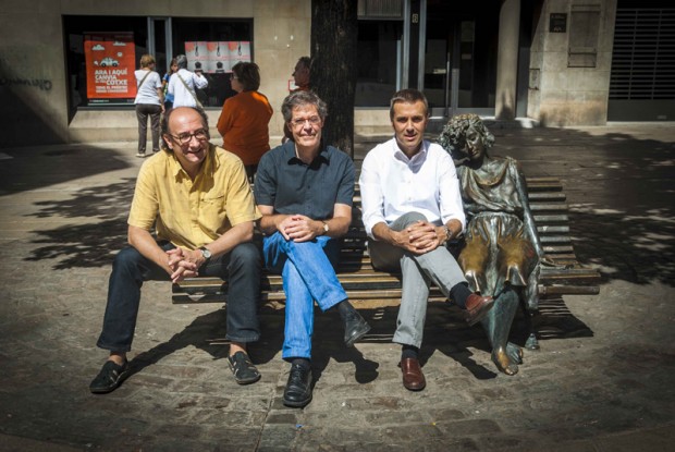 L'actual regidor de Cultura, Joan Calmet, acompanyat dels seus predecessors, Ignasi Perramon i Ramon Fondevila, asseguts al banc amb l'escultura de Ramon Oms, La noia de la Plana, instal•lada en època de Marcel•lí Llobet. L'exalcalde Juli Sansclimens explica que l'actual ministre d'Hisenda, Cristóbal Montoro, en té una rèplica en petit al menjador de casa, arran d'una conferència sobre economia que va pronunciar per encàrrec de Caixa Manresa. Foto: Jordi Alavedra