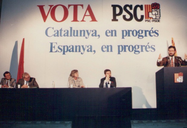 Míting del PSC a Manresa amb Marsal, Raventós, Balletbó i Serra, al faristol