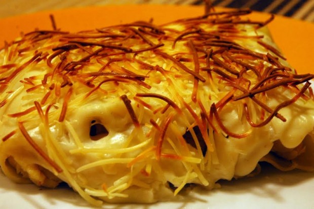 Ingredients (per a 4 persones): Picada: tres grans d’all, romaní, farigola, ametlles torrades, oli, sal, pebre, pa sec/torrat i una làmina de tòfona. Estofat: 8 mitjos peus de porc (cuits i envasats al buit), 2 botifarres negres, dues cebes grans, dos grans d'all, conyac de tòfona, brou, bitxo, sal i pebre. Pasta de caneló. Beixamel: 35g de mantega i 35g de farina per litre de llet. Formatge ratllat i en pols.