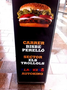 Començo la primera esbandida del 2015 amb una imatge corprenedora de la qual és responsable la multinacional nord-americana de menjar ràpid Burger King. L’anunci sobre tòtem metàl·lic que mostrem a la fotografia està instal·lat al carrer d’Àngel Guimerà, just a la vorera contrària del punt en què hi ha la parada de totes les línies urbanes d’autobús. Com veieu, el cartell anuncia que l’hamburgueseria es troba al complex dels “Trollols”. Lamentable, la veritat. No costaria gaire fer una consulta de la toponímia local. És clar que, potser, els més benvolents podrien pensar que el dissenyador de l’indicador sigui un superfan de les històries fantàstiques de J. R. R. Tolkien portades amb gran èxit al cinema en els últims anys i en què els