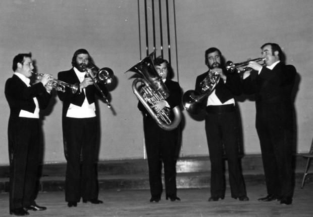 CRÒNICA SOCIAL. La fotografia és del dia 30 de novembre de 1974, a la sala d’actes del Conservatori Municipal de Música, situada a la primera planta de l’entrada principal del teatre Conservatori. Aquell dia hi va actuar The London Gabrieli Brass Ensemble.