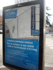 Molt de compte amb la luctuosa coincidència que mostro per començar la pentinada d’aquest mes. Les fotos es va fer el 26 de gener i, uns dies més tard, ja havia canviat la cosa. La cartellera il·luminada de dues cares que s’hi veu és a la zona de la Bonavista, abans d'arribar a la plaça de l’Onze de Setembre. A les instantànies podeu veure dues cares de la mateixa moneda. No en va, hi ha anuncis de dues de les funeràries que operen a la ciutat i que, òbviament, es disputen la clientela. El lema d’una és “al teu costat" i de l'altre: "més a prop teu".... En tot cas, aquesta “proximitat” de l’encaputxat amb la dalla ja em genera calfreds. I si és per partida doble, encara més.