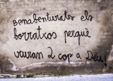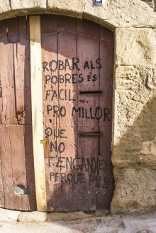 És clar que aquest lapsus anàrquic no arriba, ni de bon tros, a les mostres d’enginy plasmades a altres parets de Manresa que, com podeu llegir a les pàgines centrals d’aquest número, és com l’oest americà una “ciutat sense llei” per a la bretolada i la “decoració” de murs. La foto, en aquest cas, ens la fa arribar una col·laborador que vam enviar de safari per retratar indrets degradats per il·lustrar el tema del mes. Val a dir que la frase és enginyosa, però no puc justificar l’embrutada de la façana i, sobretot, la falta d’ortografia de