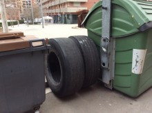 Una altra imatge que reproduïm suscita una pregunta ben clara: com han pogut arribar dos pneumàtics de camió fins al costat dels contenidors del carrer Carrasco i Formiguera? Quim Masferrer, el
