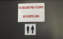 penyora de fer ús del lavabo. Però, és clar, hi ha gent que aquesta mínima deferència no la té i no té en compte que, en els establiments de pública concurrència, la neteja del vàter és una bona murga i costa temps i diners. En una paraula, és un servei per als clients i al propietari o als treballadors els molesta molt que el facin servir i, sobretot, l’embrutin transeünts que ni tan sols fan una consumició. Per això, si hi aneu, trobareu el cartell que reproduïm a la porta del lavabo. Si sou clients, l’ús és gratuït. Si el voleu fer servir d’urinari públic, haureu de rascar-vos la butxaca.
