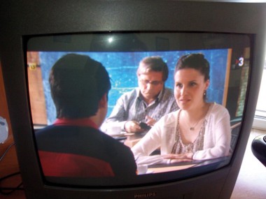 Continuant amb les arts interpretatives, abordo, com a postil·la, el naixement d’una estrella. En el capítol del serial de TV3 La Riera emès el dijous 28 de maig, mig Manresa va quedar estupefacta en veure quin client hi havia al conegut establiment de Sant Climent mentre conversaven dos dels protagonistes. El podeu veure en aquesta foto que va fer un membre d’Òmnium al televisor de casa. El reconeixeu? És el Jaume Puig. I, sens dubte, i per la cara que hi posa, feia una trucada molt important. El que ja no sé dir-vos és si era per un tema familiar, estava relacionada amb el Pou --és el president de l’Associació Cultural que ens edita-- o amb Òmnium Cultural. El Jaume fa poc que va deixar la presidència de l’entitat, però té fil directe amb Muriel Casals per ser cridat a files quan calgui. Sigui com sigui, l’actuació va ser del tot convincent. La veritat és que no era allà per casualitat. Durant el transcurs de les pràctiques d’un màster de correcció i assessorament lingüístic que és a punt d’acabar, va ser als platós d’Esplugues de Llobregat on TV3 enregistra els interiors de la telenovel·la. En una seqüència faltava un figurant, el Jaume s’hi va prestar i va tenir el seu minut de glòria.