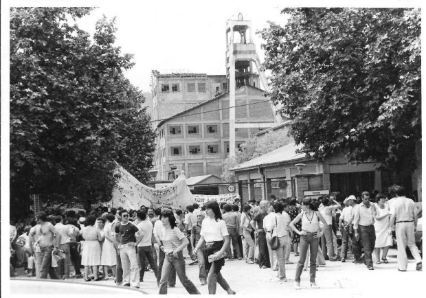 CRÒNICA SOCIAL. Diumenge 12 de juny de 1983. Després d’una llarga marxa des de Manresa per la Comarcal 1411, un grup de manifestants es concentra a Vilafruns per donar suport als miners tancats sota terra des del 31 de maig.