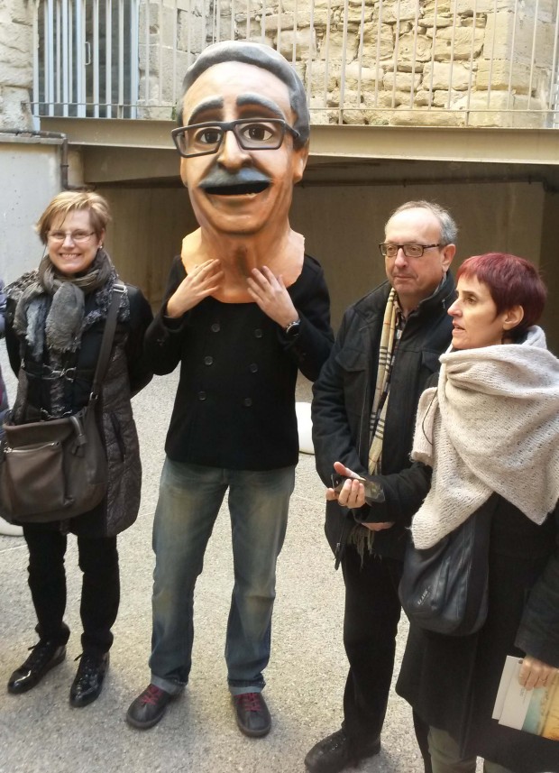 M’expliquen que Òmnium Bages va organitzar una visita a l’Espai Pedrolo, al castell de Concabella, a la Segarra. Hi havia, entre d’altres capgrossos, un amb la cara de Manuel de Pedrolo i els participants, durant la visita, van ser convidats a col·locar-se’l. Davant dels dubtes, en qualsevol entitat, sempre decideix el criteri del President. Així doncs, la persona ideal per dur-lo va ser, sense discussió, el president de la delegació, Jordi Corrons. Aquí el teniu, retratat, amb la seva considerable alçada i caracteritzat amb la cara de l’autor de Mecanoscrit del segon origen.