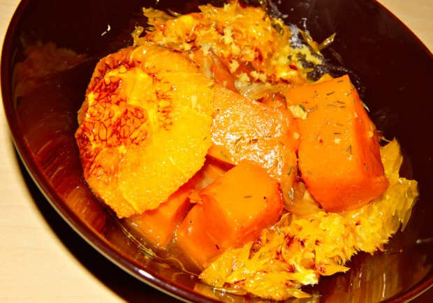 Carbassa amb ceba ofegada, pernil i taronja