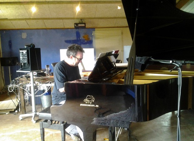 Carles Cases tocant el seu piano, situat al centre de l'estudi. Foto: Anna Pujol