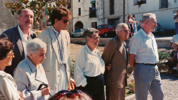 Néstor Almendros, el nebot, els tiets calderins i el Sergi, el seu germà. A primer terme, Maria Cuyàs, mare de Néstor. La fotografia és del dia de l'homenatge a Joan Cuyàs, el 1988 (Foto: Joan Serra)