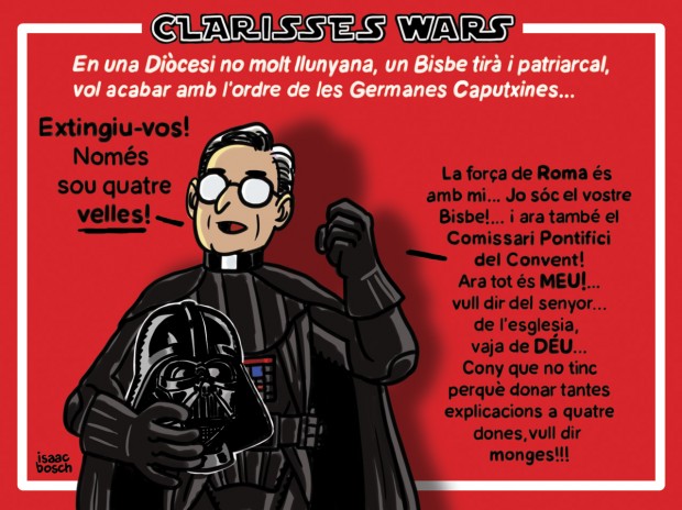 La cirereta del pastís, però, són les declaracions de les germanes que van desenterrar la destral del guerra. Textualment, segons les caputxines, «el bisbe de Vic ens va arribar a dir que érem quatre velles que ja no sabíem què ens dèiem». Un aplaudiment per a Romà Casanova que, per acabar-ho d’adobar, es va proclamar Comissari Pontifici del convent. Des dels temps de Galceran Sacosta i l’excomunió de Manresa no se sentia res semblant! La FSSM fora i ja us enviaré unes tutores més velles que vosaltres a fer-vos companyia. Quina vergonya! El que hauria de començar a fer l’Església en aquest país és pagar algun impost i corresponsabilitzar-se més amb la realitat del carrer. Ja pot anar predicant la pastoral el papa Francesc des de Roma. Aquí, el bisbe és com un senyor feudal. Què en farà del convent? Deixar que s’ensorri? Com la Seu? Si s’acorda donar-li un ús social ja es pot passar l’aprovació canònica per la santa sotana.