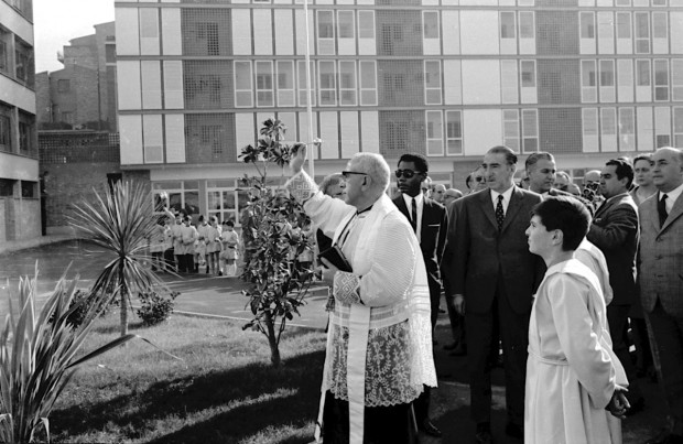 La fotografia mostra la benedicció de les noves instal·lacions, el 25 de novembre de 1968, per l’arxipreste de Manresa i vicari episcopal, mossèn Jaume Franquesa i Burdó. En segon pla, podem veure, d’esquerra a dreta: el director d’Ensenyament primari a la Guinea recentment independitzada, Bonifacio Bilan; el governador civil, Luis Garicano Goñi; l’alcalde Ramon Soldevila i el director de la Confederación Española de Cajas de Ahorros, Luís Coronel de Palma. Moments després, el doctor Joan Soler Cornet, vicepresident de la caixa manresana, va escenificar l’entrega del col·legi a la ciutat.