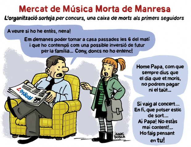 Ras i curt, un procés força semblant a la República Catalana. El carrer, el poble, carrega de raons els polítics i aquests, amb més o menys habilitats, recullen el guant i les coses o es materialitzen... o queden en una bonica declaració d’intencions. En aquest context, no pas de derrota no us precipiteu, ha nascut el Mercat de Música Morta de Manresa, en una contraposició al certamen que es fa a Vic i en el qual la música sí que n’és, de viva. Per acabar d’arrodonir el tema, els organitzadors ho han fet coincidir amb Tots Sants i la tradicional –i fúnebre– tradició de visitar cementiris i tombes. Des d’aquestes ratlles, una felicitació per la iniciativa i, sobretot, per continuar esmolant l’enginy manresà per plantejar mogudes culturals, encara que neixin d’un context "underground".