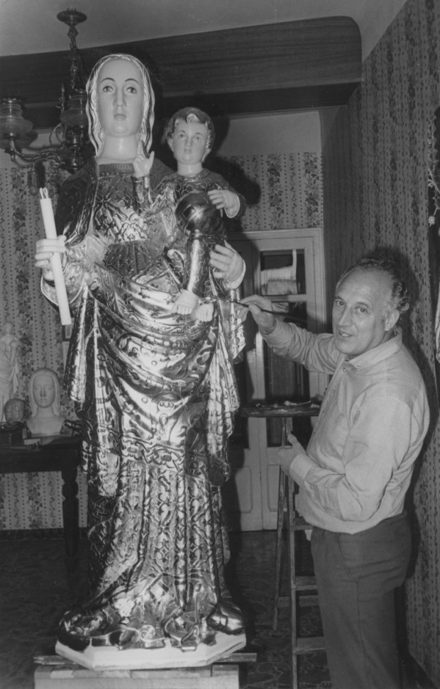 Un any més tard, el 25 de maig de 1980, Manresa deixava enrere el trist succés amb la benedicció d’una rèplica de la Verge de l’Alba, sufragada per la parròquia i la subscripció ciutadana. La imatge era obra de l’escultor Ramon Majà i del decorador Pere Roca –a la foto–, i incorporava un fragment de la talla cremada. Tant la consagració dominical com el concert de corals del dia abans van omplir la Seu de gom a gom, en una gran mostra d’estima a un dels símbols del patrimoni ciutadà.