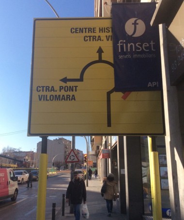 Si el cartell anterior destaca com a exemple de feina ben feta, la foto que em passa una amic feta a la carretera de Vic, molt a prop de la nova rotonda, representa tot el contrari. Talment com si la placa informativa del trànsit hagués estat plantada per l'acreditada empresa Pepe Gotera y Otilio, chapuzas a domicilio o potser per Rius i Canals, bunyols municipals que, crec, és la marca amb què es contracta l’obra pública a Catalunya. En fi... a algú se li acudiria plantificar un gran panell com aquell just darrere d'una banderola publicitària que el tapa? Em sembla que no calen ni comentaris.
