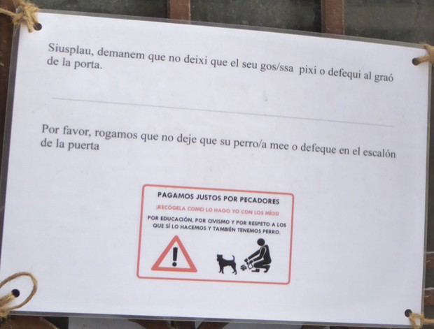 Com s’apunta al "Tema del Mes", el dimecres 31 de gener passat es va inaugurar una placa commemorativa en memòria del periodista Josep Maria Planes al carrer de la Canal. L’endemà, l’autor del reportatge central, Carles Claret, va anar fins a l’indret en qüestió a immortalitzar-la de prop i de dia. En baixar cap al carrer del Born, encara amb la càmera entre les mans, es va trobar amb una cartell al portal de la casa cantonera que queda a mà esquerra que també va voler retratar. Es tracta, malauradament, d’una altre advertiment i apel·lació al civisme ciutadà davant de la defecació descontrolada de cans, però força més elaborat. El lema "Paguem justos" per pecadors i l’ús d’iconografia és ben destacable.