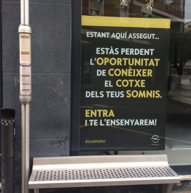 El mateix amic també em fa notar la casualitat que es produeix a la parada d'autobús del carrer de Sant Cristòfol, gairebé on desemboca a la carretera de Vic, que veieu a la fotografia. El punt s’escau, precisament, just davant del concessionari de la marca Opel i, d'alguna manera, sembla que t'està dient que en lloc d'agafar l'autobús, et compris un cotxe. Més clar que l'aigua: una marquesina del transport públic que promou l’ús del vehicle privat.