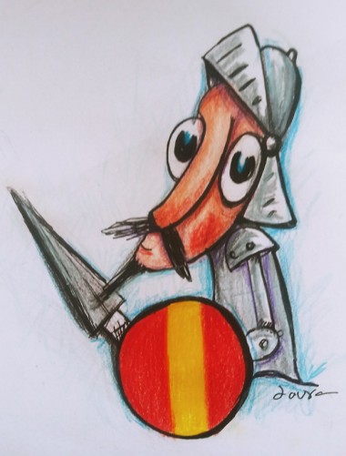 En un lloc del Pla de Bages, el nom del qual tots coneixeu, de temps ha que hi viu un Quixot molt cervantí que confon un grup de iaioflautes intentant fer-se una foto dalt del Collbaix amb un exèrcit de piròmans disposats a cremar amb les seves pipes els onze metres de bandera espanyola que guarneix el seu fortí, on viu atrinxerat amb la seva dolça Dulcinea, sotmesa a l'amenaça dels llaços grocs, que remoguts pel vent semblen flames destructores, atiades per les pales d'un molí gegantí, comandat per la mà supremacista de l'alcalde. Mentre el regent Rajoy i el seu lacai Albiol tracten de consolar la desconsolada dama amb sentits mots de suport, aquesta deixa caure una llàgrima a la sorra del programa de la Griso que, commocionada, la converteix en diluvi universal. On s'és vist que, en no poder calar foc a la bandera, els terroristes hagin cremat quatre papers al portal de «Si nosaltres no fem cap mal a ningú ni pertanyem a cap associació», declara la pobra Dulcinea, «llevat de l'associació sense ànim de lucre Democracia y Unidad, dedicada a maltractament de la dona i al maltractament infantil (sic)». Mentre l'Espanya de Rajoy, Albiol i Griso s'uneix al dolor de Dulcinea, el seu Quixot planta cara tot sol als avis incendiaires, amb aquestes valentes paraules dissuassòries: «Sois unos terroristas y tú eres una mal follada, sí, tú. Vete a tu casa a hacer la faena, guarra. A la mierda, cabrones. Todos en la cárcel. Y fusilados. Si volviera Franco no dejaría ni uno. Hijos de puta».