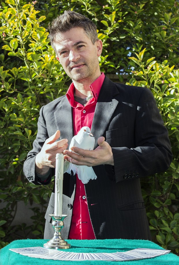 Estén una baralla de cartes sobre la taula. Es treu un jersei de llana blau marí i es corda una camisa vermella de conjunt amb una americana negra. Avança cap al fons del seu local on té una pati amb una gàbia amb dos coloms domesticats. Obre la porta i n’agafa un que es manté quiet a les seves mans. Les plomes són blanques i ressalten el color dels ulls. Vermells. «El poder d’atracció que genera la màgia em va captivar quan tenia dotze», explica el mag manresà Jordan Bosco. Ara en té quaranta-un i, al llarg d’aquest temps, ha arribat a la conclusió que la màgia només transmet si el mag es capaç de ser ell mateix. Aquest és el consell que dona als alumnes que assisteixen a les seves classes particulars en un local del carrer de la Sardana, de Manresa. Un espai que vol convertir en una botiga on vendre els jocs de màgia que fabrica ell.