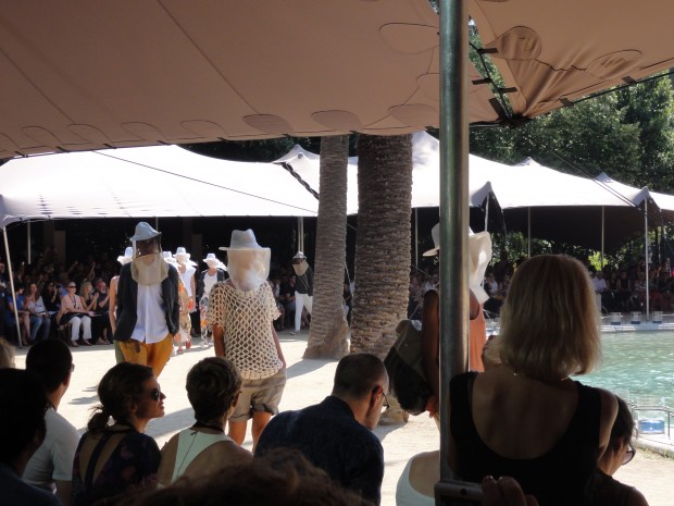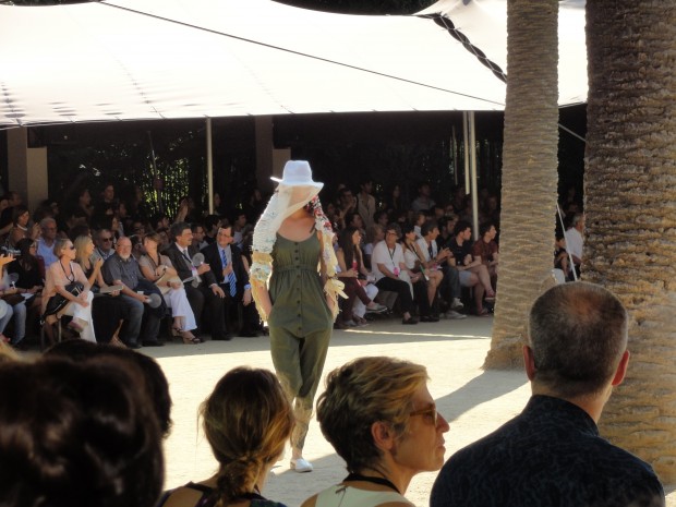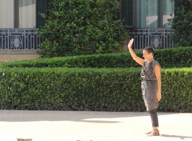 La desfilada va ser a l’exterior del Palau, al voltant de les fonts, rodejades per els models. Miriam Ponsa va sortir al final de la passarel·la per agrair als presents els aplaudiments.