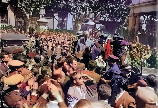 La foto és del 7 de juny de 1931: el nou president de la Generalitat recuperada, Francesc Macià, entra al pati del Kursaal amb cotxe descobert per assistir a la commemoració de les Bases de Manresa, en un bany de multituds. La pràctica totalitat dels presents són homes, potser perquè fins al 1933 les dones no van tenir drets polítics. Sigui com sigui, la instantània, magnífica, presenta la diversitat social que s’aplegava sota la proposta republicana que