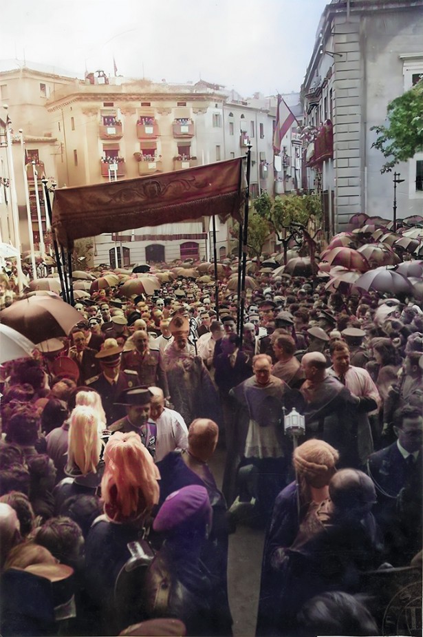 Alzamiento l’any 36. Aquesta és la fotografia: l'arribada a la basílica sota pal·li per assistir a un tedèum d’acció de gràcies. Al voltant, gorres de plat, boines vermelles dels requetès, tricornis i plomalls de gala per als municipals, a més a més de tota la jerarquia eclesial i —la festa era grossa— fins i tot el macer de la ciutat obrint la comitiva. I per tot el voltant, els paraigües que acabaven d’endolar el migdia.