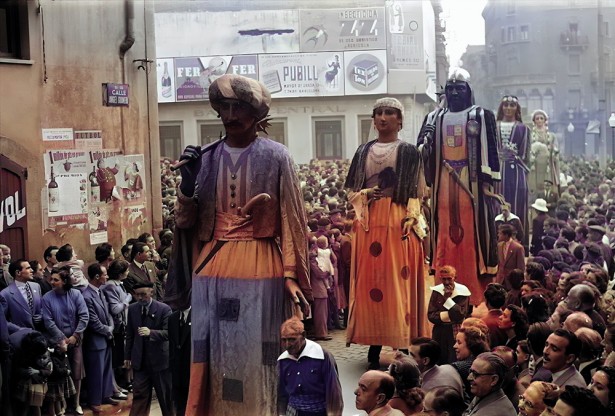 Som a l’entrada del carrer Guimerà, i de fons es distingeix el nou edifici del Banco Central, en obres i amb publicitat d’insecticida, la Fonda Restaurant Pubill de Barcelona o els cubets de caldo TexTon (“¡Un buen caldo vale por media comida!”). La gernació que acompanya la desfilada no és tan sorprenent si tenim present que els entreteniments —encara menys els gratuïts— eren poc habituals i que bona part del públic encara passava força gana. Les cartilles de racionament van durar de 1939 a 1952, i la televisió i el sis-cents encara trigarien més d’una dècada a popularitzar-se, i no pas per tothom ni tampoc de seguida. Però aquella tarda de diumenge va ser una veritable festa amb el padrinatge dels gegants de Barcelona i la presència de la majoria de gegants del Bages, Solsonès i —a la foto es reconeixen— també els de Berga. Enmig, un municipal de Sant Domènec, guarnit amb salacot. I tot plegat amb un episodi singular: la discussió sobre la llengua autoritzada en el moment del lliurament de la Geganteta, que des d’aquell dia quedaria incorporada a la imatgeria de la ciutat. L’alcalde va cedir i finalment el lliurament es va poder fer en català. Però... aquest tros no va poder pas ser transmès per Ràdio Manresa!