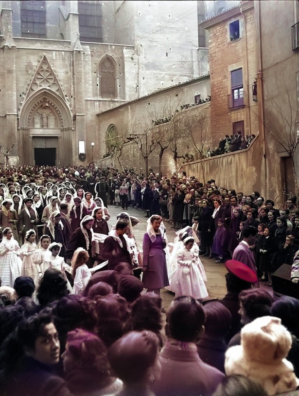 Gremi va adreçar-se a mossèn Genís Padrós Pladevall, vicari de la Seu i personatge de pes a la ciutat, per obtenir el seu suport. I, tal dit tal fet, aviat van començar les primeres activitats que van ser la crema de falles o ninots a la plaça Major amb molt d’èxit, encara més si es repartia xocolata entre la canalla assistent. O, en la foto que ens ocupa, amb la donació de la Geganteta a la ciutat, el 21 d’octubre de 1951.