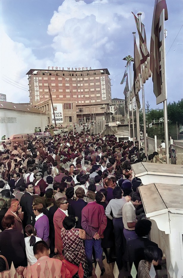 planes de desarrollo impulsats pels nous ministres tecnòcrates disparaven el PIB espanyol. Coincidint amb la Festa Major, doncs, i afegint vuit dies més, entre el 29 d’agost i el 8 de setembre d’aquell any cent cinquanta expositors de diversos sectors —indústria, comerç, automoció, serveis...— van participar en el certamen, i els visitants es van xifrar en un total de 100.000 persones. Talment com Plácido, en aquells anys signant «lletres» —pagant a terminis— hom ja podia adquirir nevera, televisió, rentadora i —fem un esforç!— fins i tot un automòbil. La foto és prou representativa de l’expectació que hi bategava: la Fira era al passeig del Riu, a les antigues instal·lacions dels Ferrocarrils Catalans, i l’entrada costava cinc pessetes però el públic hi arribava a raig fet. De fons s’alça el futur hotel Pere III —aleshores Pedro III— que encara no llueix el seu propi rètol lluminós, sinó que anuncia aquella «Feria de Manresa» com a preludi d’uns temps moderns, turístics i