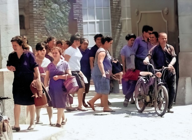 Només per enllestir aquest recorregut històric ens aturem a la dècada dels setanta: dues fotografies expliquen els canvis que definitivament es produiran. L’un, en el món del treball. L’altre, a les institucions. A la primera foto tenim un canvi de torn de la fàbrica tèxtil Bertrand i Serra, la Fàbrica Nova, de data desconeguda, provinent del Fons Art Viu, a l’Arxiu Històric del Bages. Els crepats de perruqueria ajuden a situar la imatge, en un contingent laboral majoritàriament femení. També la fràgil motocicleta d’un dels dos homes. Sigui com sigui, tots plegats molt probablement desconeixien els conflictes de trenta anys enrere, però eren ben conscients dels actuals. La fórmula del sindicat vertical que venia dels anys de Falange —aleshores que els treballadors se’ls anomenava