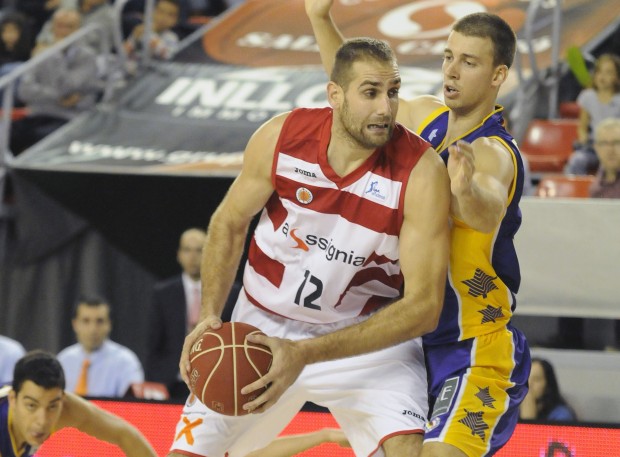 Oliver Arteaga defensat pel tirador Uros Tripkovic, una de les amenaces principals del Valladolid. Foto: Manel Mas