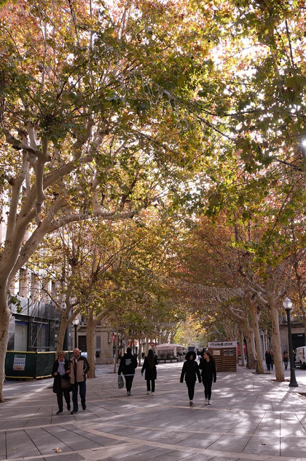 platani acerifolia, arbres de vida no molt llarga, però de grans dimensions (poden tenir més de 30 metres d’alçada) i amb poca exigència d’aigua i de minerals específics. Són fàcilment adaptables al subsol de les grans ciutats, on generalment no permeten que visquin uns altres vegetals al seu voltant i són sobretot arbres de creixement molt ràpid, especialment després de les esporgades, amb una escorça que es pot anar desprenent a trossos i uns fruits esfèrics, generalment pedunculats i recoberts d’uns pèls lleugers que s’escampen per l’aire i poden provocar estossecs i esternuts a la primavera. Tampoc no m’havia fixat que les fulles caigudes al final de la tardor, a diferència del que fan les de molts altres arbres caducifolis, no es podreixen ràpidament a terra ni es trenquen, sinó que es mantenen molt temps seques i senceres, amb la forma i mida típiques d’unes mans lliures que voleien quan fa vent.