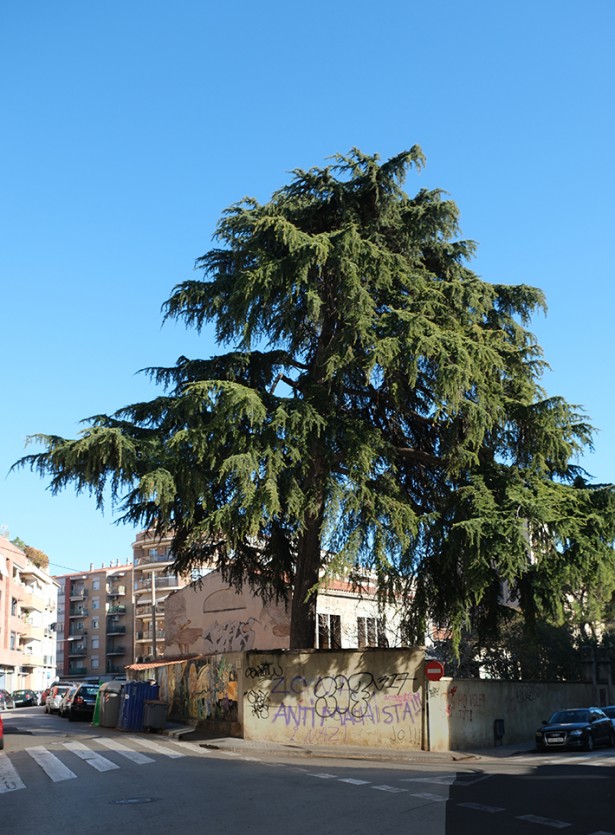 Al final del carrer Verge de l’Alba, on fa xamfrà amb el carrer de la Caritat, i dins del recinte on hi ha l’anomenat Xalet de Casa Caritat, destaca habitualment la verdor d’un cedre esplendorós que puja ben dret i que sobresurt magníficament per damunt de les parets que el separen d’aquells dos carrers. El seu volum i frondositat certifiquen que va ser plantat ja fa molts anys i que l’indret li ha estat favorable, li ha agradat i li ha permès desenvolupar-se sense problemes. Personalment, sempre l’hi he vist i en tinc un record ben concret i explícit des d’una època que ara ja és força llunyana.
