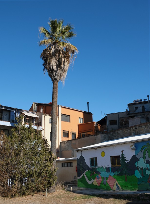 Ara, però, parlem de la unió de dos elements que també costen de relacionar, que en un inici també es fa estrany pensar-los junts, però la ganyota que generen si els coneixes és la d’un somriure: Manresa i una palmera. I potser us preguntareu, què hi pinta a Manresa una palmera? I on és aquesta raresa? Doncs sí, a Manresa hi ha una palmera i aquelles persones que la coneixem n’estem ben orgulloses! Es troba al pati del local de l’Agrupament Escolta Cardenal Lluch, al carrer Vallfonollosa, i l’origen és encara bastant incert. No es tenen referències de qui la va plantar allà ni per què, però la palmera ja apareix a les fotografies aèries que Josep Gaspar va fer entre els anys 1926 i 1929, actualment publicades a memòria.cat. Estem parlant d’una palmera centenària!