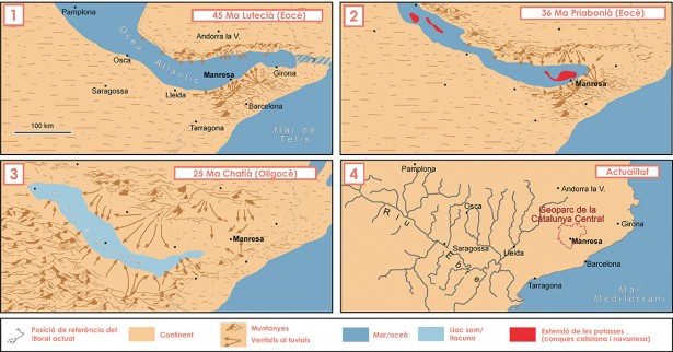 «Les més antigues –continua Climent– van ser formades en ambients marins, que són les calcàries fossilíferes i esculloses, margues, etcètera; després, i a mesura que el mar s’anava assecant, es van formar sediments evaporítics de sulfats, com el guix, i sals, com l’halita, la silvita i la carnal·lita». A partir de fa uns 36 milions d’anys, es van començar a formar per sediments en rius i llacs: l’evolució final d’aquesta conca marina, anomenada Conca potàssica catalana, és «un dels millors exemples a escala mundial» i conté, a més, «una de les zones mineres de potassa més grans del sud d’Europa», formada fa 36 milions d’anys, «en un context tectònic espectacular: l’aixecament dels Pirineus».