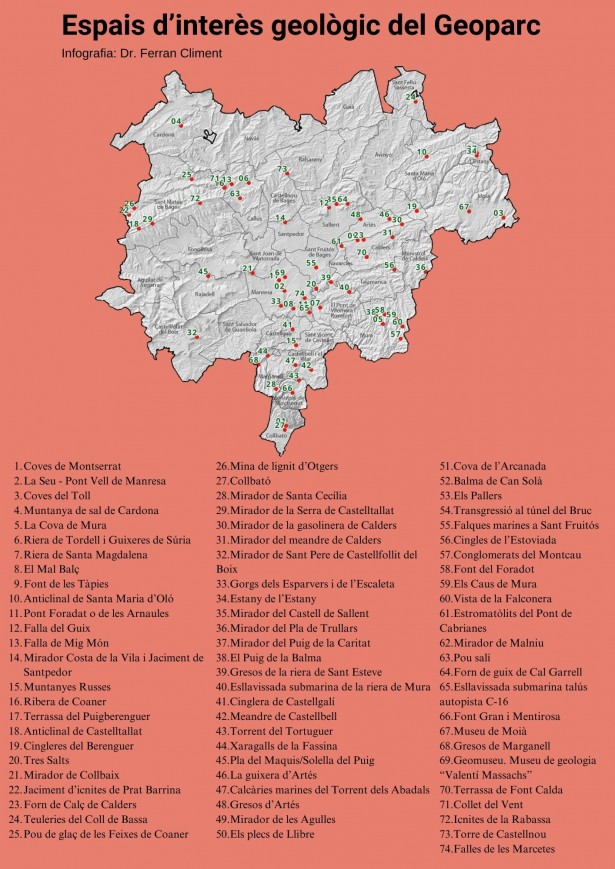 El Geoparc té una setantena de punts d’interès geològic i miner, amb singularitats excepcionals com la muntanya de Montserrat, les Coves del Toll de Moià, la Muntanya de Sal de Cardona i les Coves de Montserrat. «Aquest inventari –explica Ferran Climent– no s’ha d’entendre com una llista tancada i definitiva sinó que es revisa periòdicament i això pot representar tant modificacions, com altes i baixes»—”. En tots aquests espais es fan diferents activitats geoturístiques i formació a tots els nivells.