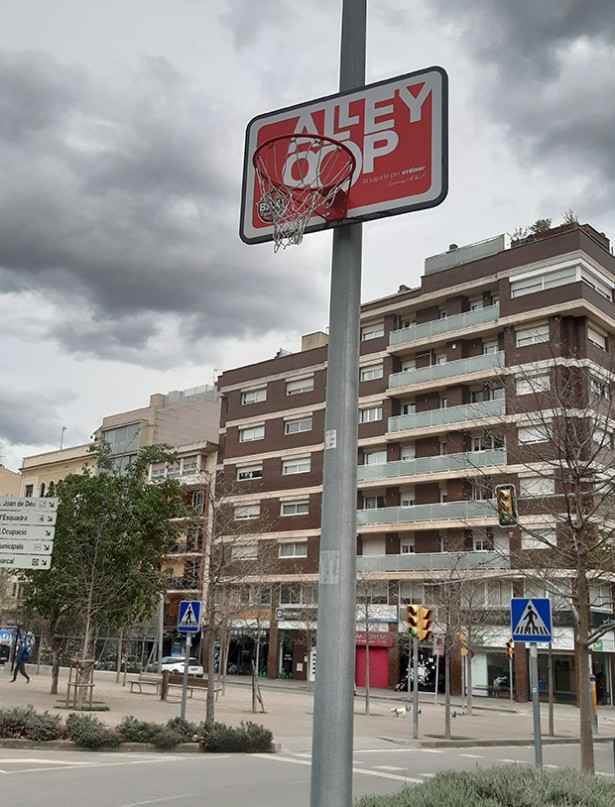 alley-oop, és a dir, a encistellar la pilota sense que toqui el terra. La iniciativa ha propiciat la instal·lació de cistelles per diferents punts de la ciutat, com la que veieu enganxada en un fanal a la plaça de la Bonavista. Llàstima que la posició del cèrcol i el tauler, enmig del trànsit de la plaça, faci ben difícil la consecució de l’alley-oop en qüestió.