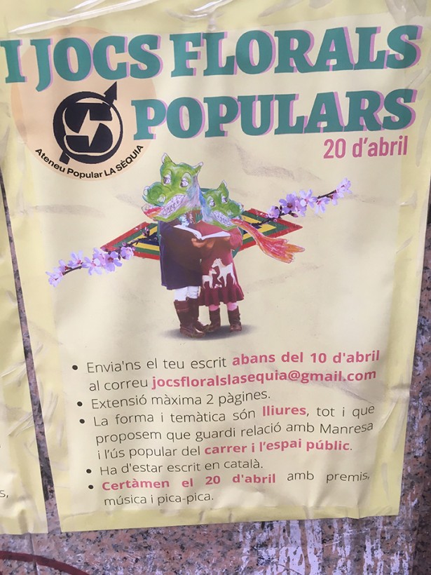 Fa unes setmanes, el Front Nacional de Catalunya de Manresa va proposar al ple municipal la recuperació els jocs florals, que, arreu dels territoris de parla catalana, val a dir-ho, han anat passant a millor vida. De fet, fins i tot a les escoles i instituts, els certàmens destinats a premiar els/les millors mestres en gai saber s’han suprimit. Sigui com sigui, i no sé pas si per influència política, des de l’altre extrem, l'Ateneu Popular la Sèquia s’han entestat a tornar-los a organitzar i convertir-los en