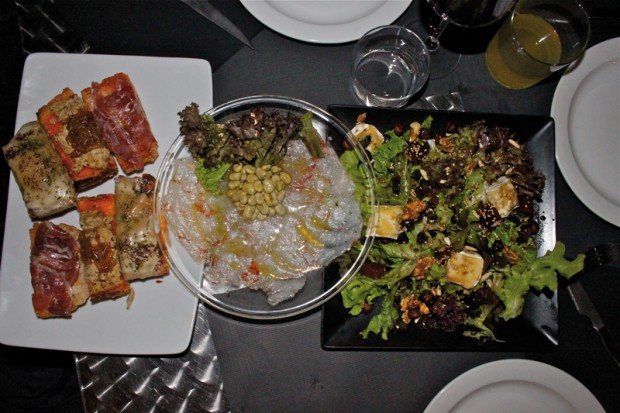 Amanida Puigterrà, carpaccio de gambes i variat de torrades. Foto: Eduard Merly