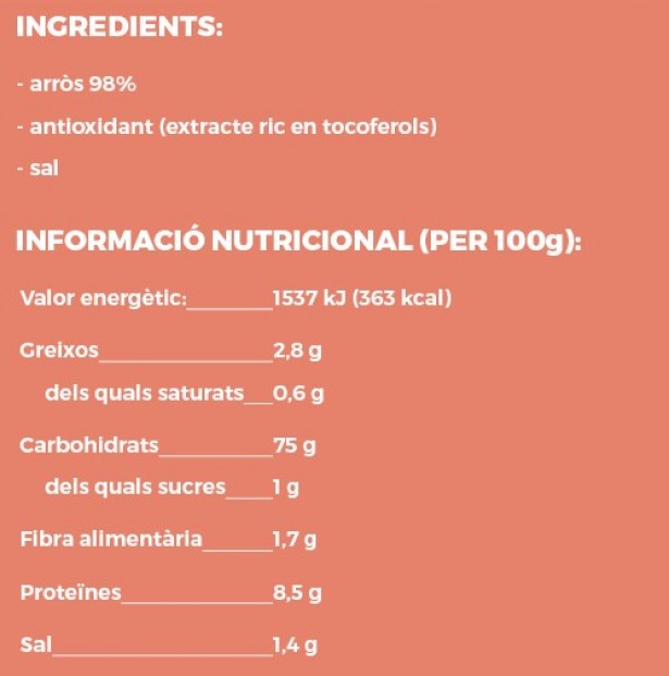 L’etiqueta correspon a unes coquetes d’arròs. És freqüent trobar-ne de diferents tipus al supermercat: de blat de moro, amb xocolata, etc. L’opció que portem avui a la secció és interessant perquè l’arròs és l’ingredient principal, amb un 98% del contingut total. També conté sal, però es tracta d’un aliment extrusionat, cosa que vol dir que s’elabora a través d’un procés industrial que permet obtenir aliments que pesen molt poc i, per aquest motiu, la quantitat total de sal per coqueta no és gaire elevada. Per tant, en el context d’una dieta equilibrada, combinar unes coquetes amb d’altres ingredients proteics com formatge, tonyina o també rics en greixos saludables com una crema de fruits secs és una opció molt interessant com a snack saludable. No es tracta, però, de menjar coquetes sense sentit un cop obert el paquet, ja que l’arròs no deixa de ser un aliment que aporta energia, tot i que sigui en un format més lleuger. En qualsevol cas, és una bona opció per incloure de tant en tant a la dieta sense problema. També val la pena recordar que l’arròs és un cereal sense gluten, fet que converteix aquesta opció adient també per a celíacs i/o intolerants al gluten.
