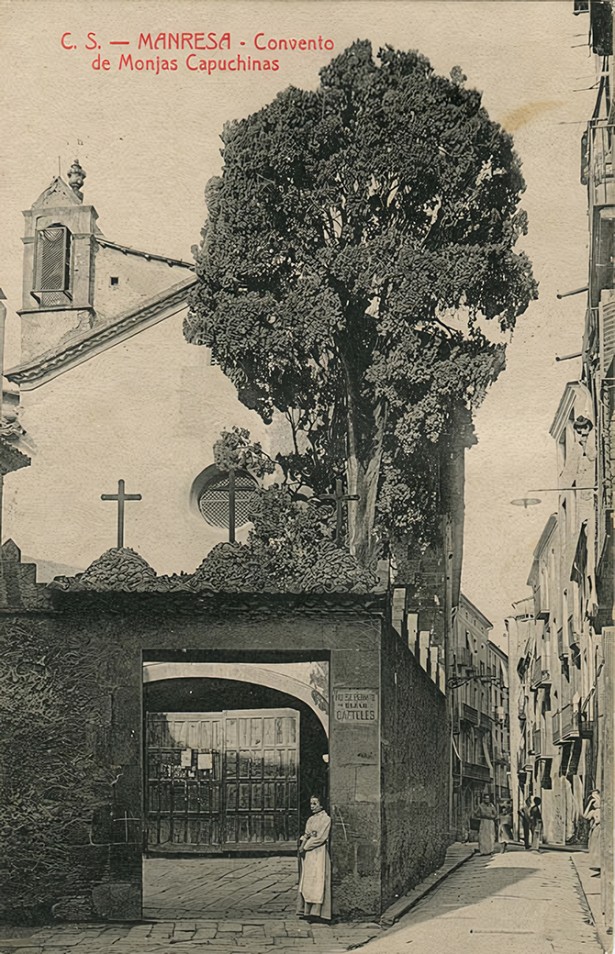 Postal del carrer de Talamanca amb la porta d'entrada al convent de les Caputxines i l'església de Sant Carles Borromeu, el 1925.