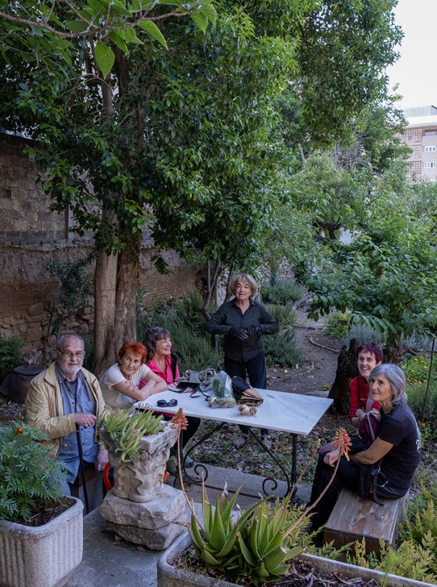 Un moment de repòs del voluntariat a l'hort de les Caputxines Foto: Enric Casas