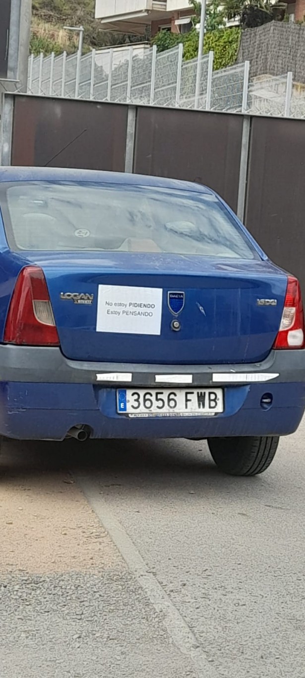 Em fan arribar la imatge d’un vehicle, aparcat des de fa temps en un carrer dels blocs de davant de Can Font, que llueix el cartell que mostra la foto i que diu textualment: “No estoy pidiendo, estoy pensando”. Un missatge ben enigmàtic, tot i que el meu informant em diu que entre els veïns del barri corre la veu que el rètol l’ha posat el propietari del vehicle, que passa moltes estones al seu interior i que així vol donar a entendre que no és cap perdulari. O això és el que sembla.