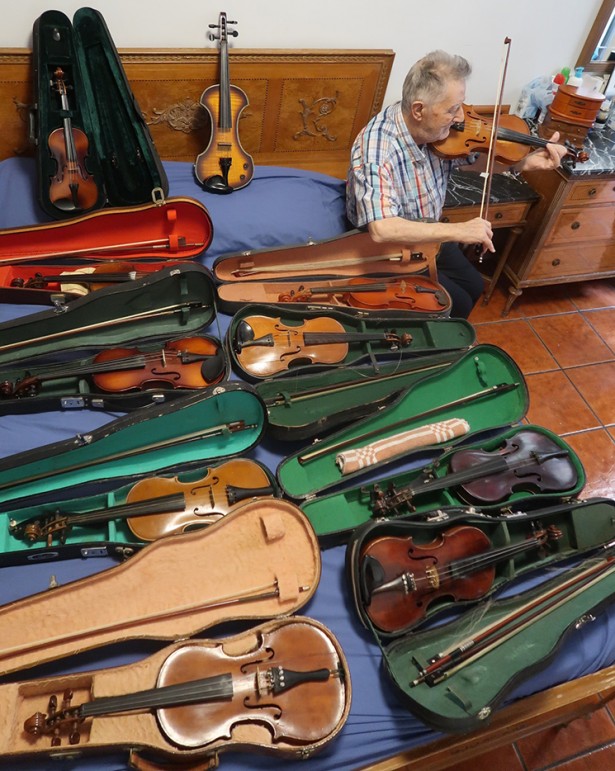 I ens mostra fotografies amb els prínceps d’Espanya, els presidents Mas i Pujol, el pintor De Soto, el gran Xavier Cugat, amb qui diu que va tocar i de qui té més d’un dibuix amb dedicatòria. Per les seves mans han passat boleros, cançons populars, peces clàssiques... i un munt de violins: «N’he deixat molts i no me n’han tornat cap». Amb tot, calcula que entre els violins que conserva damunt l’armari de l’habitació i els que té guardats a les golfes n’hi ha una trentena. Entre els quals, un mig violí, un violí tres quarts i un violí elèctric. Diu que tots sonen, si bé és veritat que la majoria fa temps que dormen el son dels justos, perquè sempre fa servir el mateix, un W. Barth. El seu fill Ricard, que també va estudiar violí, conserva un violí fabricat a Cremona, el 1701, pel lutier Joseph Guarnerius; un Collin Mezin de 1923, model que va ser premiat a l‘exposició internacional de París el 1900; i un violí bavarès de mitjan segle XIX, amb l’anvers de la caixa cobert amb la imatge de la portalada d’un castell en cuiro repujat. Rossell confessa que “més que col·leccionar, guardo coses”. I aquest és el cas de la majoria d’aquests violins, que va comprar fa més de trenta anys al també músic Ramiro Rius, que, en retirar-se, li va vendre tots els violins que tenia. I allà s’estan, començant per un George Adam Krattsch vienès de 1814.